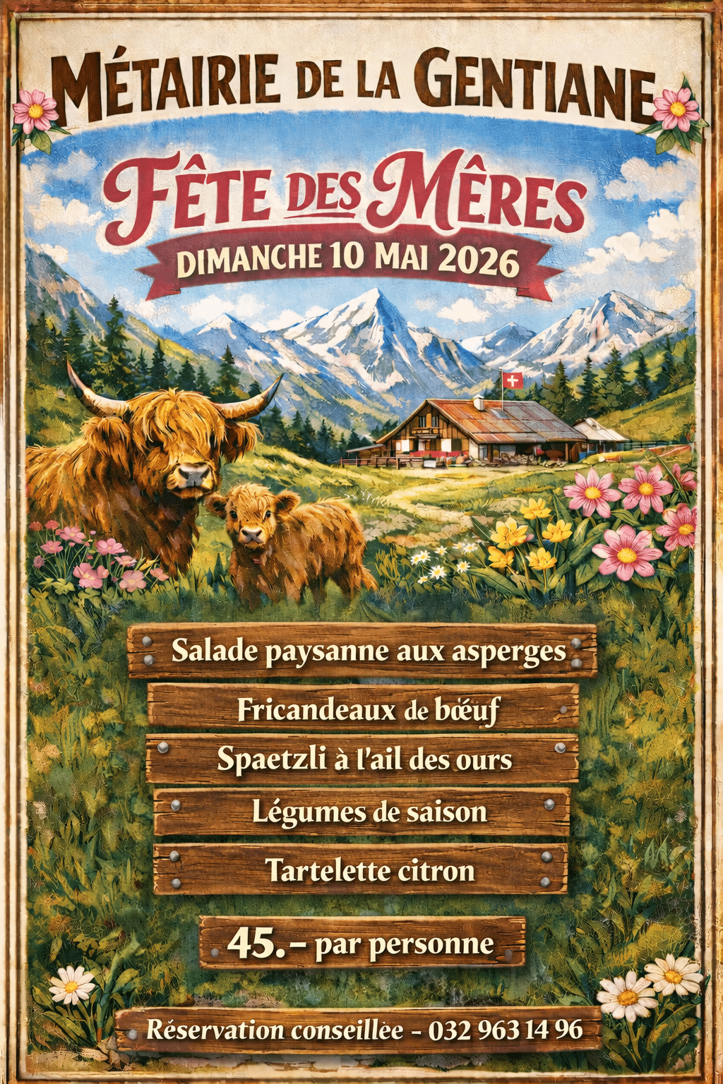 Notre restaurant propose des menus avec des viandes Highland et des plats traditionnels du Jura Bernois.